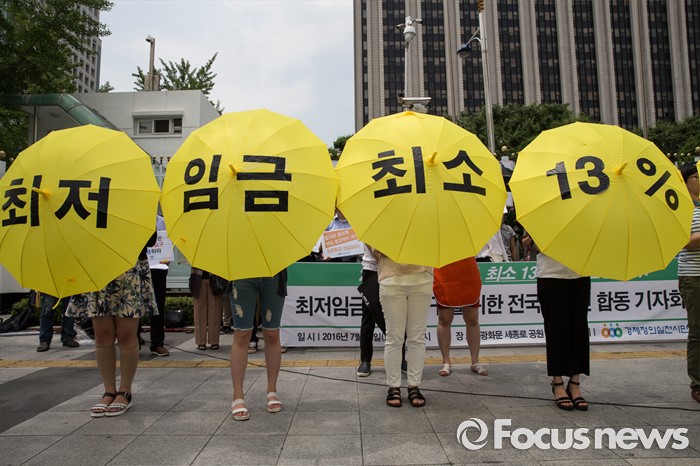 (서울=포커스뉴스) 경제정의실천시민연합 회원들이 12일 오후 서울 종로구 정부서울청사 앞에서 최저임금 인상 촉구 합동 기자회견을 하고 있다.