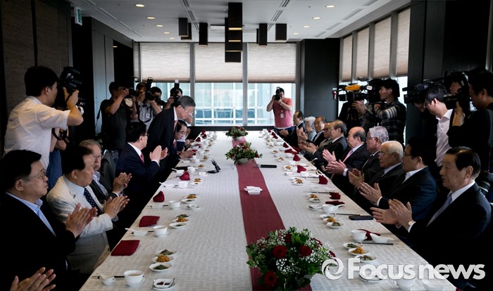(서울=포커스뉴스) 김희옥 새누리당 혁신비대위원장이 12일 오후 서울 여의도 한 중식당에서 열린 상임고문단 오찬에 참석해 인사말을 마친 뒤 인사하고 있다.