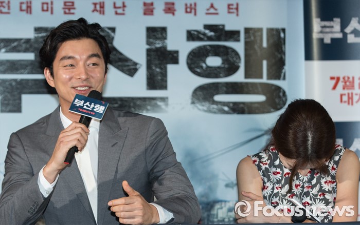 (서울=포커스뉴스) 12일 오후 서울 광진구 롯데시네마 건대입구점에서 열린 영화 '부산행' 언론시사회에 참석한 배우 공유(왼쪽)가 인사말을 하고 있다.