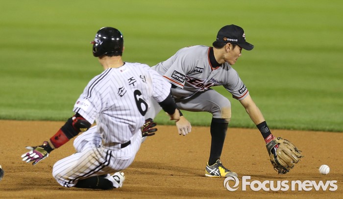 (서울=포커스뉴스) 12일 서울 잠실구장에서 열린 2016 프로야구 한화-LG 경기 7회말 LG 손주인이 중견수 오른쪽에 떨어지는 2루타를 치고 슬라이딩하며 세이프되고 있다.