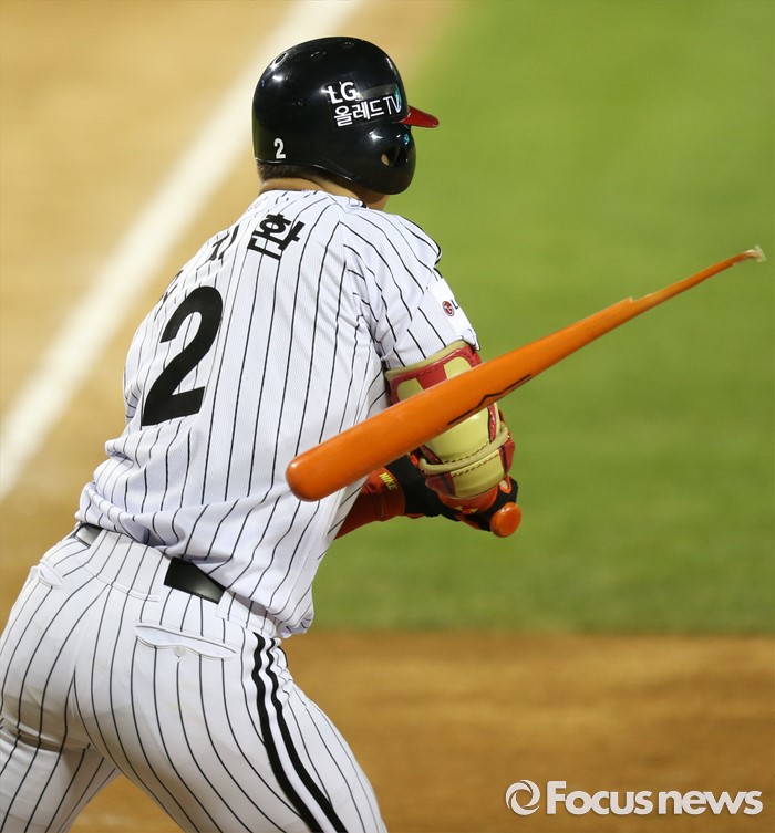 (서울=포커스뉴스) 12일 서울 잠실구장에서 열린 2016 프로야구 한화-LG 경기 6회말 무사 만루에서 LG 오지환의 타격 도중 배트가 부러지며 날아가고 있다.