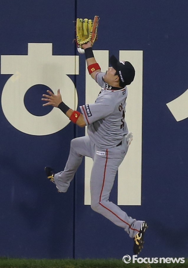 (서울=포커스뉴스) 12일 서울 잠실구장에서 열린 2016 프로야구 한화-LG 경기 7회말 2사 2루에서 한화 중견수 이용규가 LG 정성훈의 타구를 잡으려 점프하고 있다.