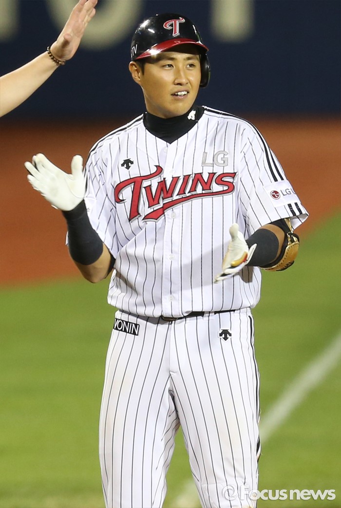 | △ 역전타 치고 기뻐하는 LG 채은성 |