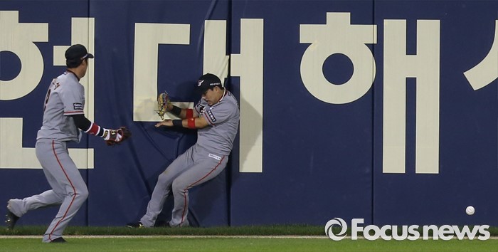 (서울=포커스뉴스) 12일 서울 잠실구장에서 열린 2016 프로야구 한화-LG 경기 7회말 2사 2루에서 한화 중견수 이용규가 LG 정성훈의 타구를 놓치며 펜스에 부듲히고 있다.