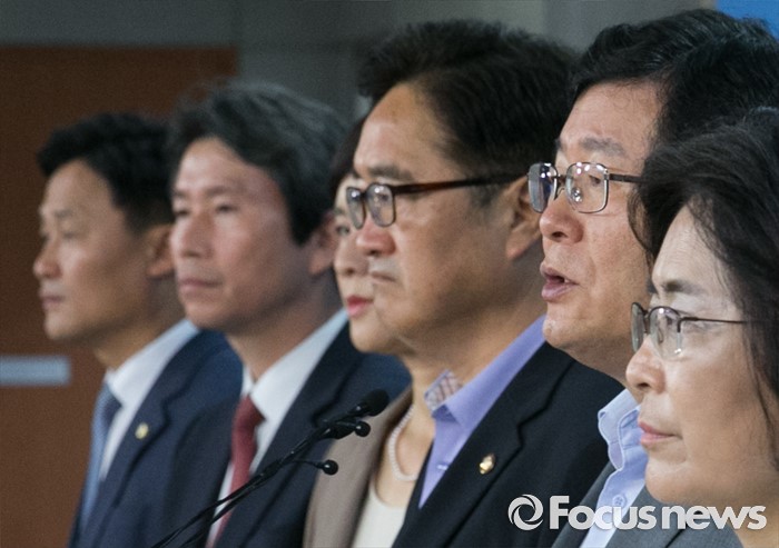 (서울=포커스뉴스) 13일 오전 서울 여의도 국회 정론관에서 더불어민주당 민주평화국민연대(이하 민평련) 소속 의원들이 한반도 및 동북아지역의 평화와 협력을 위협하는 사드배치 반대 기자회견을 하고 있다.