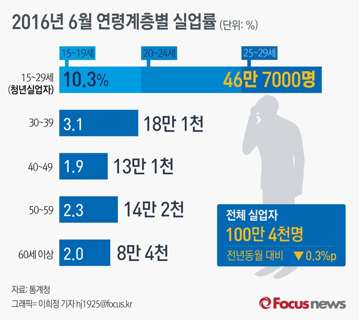 (서울=포커스뉴스) 통계청이 13일 발표한 '6월 고용동향'에 따르면 6월 청년(15∼29세)실업률은 10.3%로 전년동월대비 0.1%포인트 증가했다.