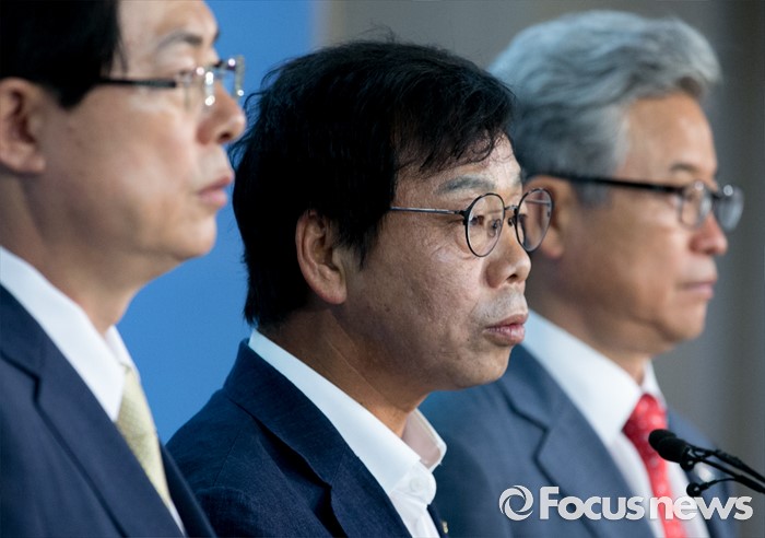 (서울=포커스뉴스) 13일 오전 서울 여의도 국회 정론관에서 이완영(경북 고령·성주·칠곡, 가운데) 새누리당 의원과 이만희(왼쪽), 이철우 의원이 사드 대구 및 경북지역 사드배치와 관련 항의 기자회견을 하고 있다.