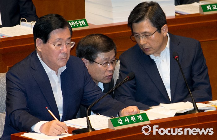 (서울=포커스뉴스) 13일 오전 서울 여의도 국회에서 열린 예산결산특별위원회 전체회의에 참석한 황교안(오른쪽) 국무총리와 황희종(가운데) 국방부 기획조정실장이 대화하고 있다. 왼쪽은 황찬현 감사원장.