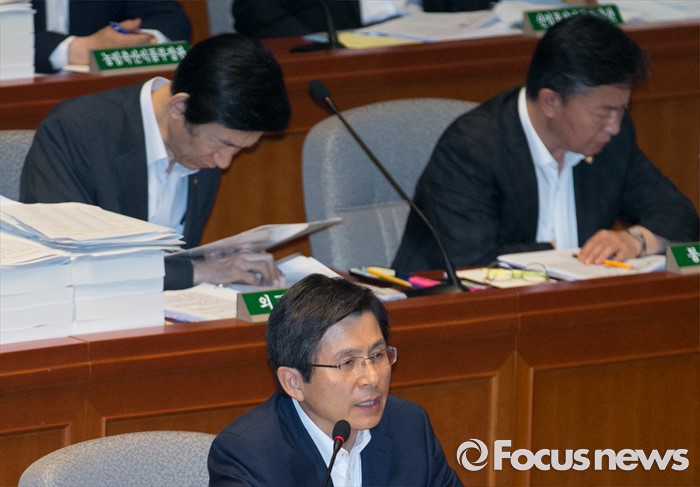 (서울=포커스뉴스) 13일 오전 서울 여의도 국회에서 열린 예산결산특별위원회 전체회의에 참석한 황교안 국무총리가 의원들의 질의에 답하고 있다. 뒷줄 왼쪽부터 윤병세 외교부 장관, 홍용표 통일부 장관.