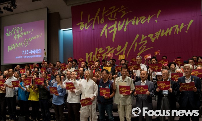 (서울=포커스뉴스) 13일 오전 서울 중구 프레스센터에서 열린 '한상균을 석방하라, 민주주의 살려내자' 7.13 시국회의에 참석한 시국선언인단이 구호를 외치고 있다.
