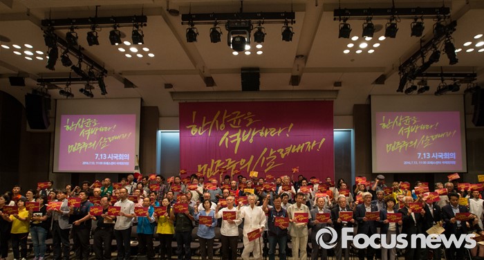(서울=포커스뉴스) 13일 오전 서울 중구 프레스센터에서 열린 '한상균을 석방하라, 민주주의 살려내자' 7.13 시국회의에 참석한 시국선언인단이 구호를 외치고 있다.