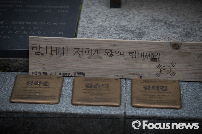 (서울=포커스뉴스) 자위대 창설 62주년 기념행사가 서울 한복판에서 열리고 하루가 지난 13일 오후, 서울 종로구 주한일본대사관 앞에서 일본군 '위안부' 문제 해결을 위한 제1239차 정기 수요집회가 열리고 있다. 소녀상 아래 할머니들의 이름이 새겨진 동판이 나란히 자리하고 있다.