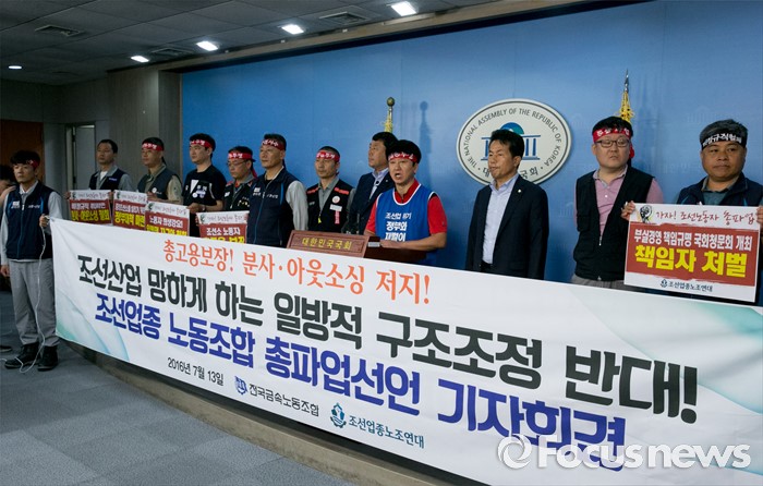 (서울=포커스뉴스) 13일 오전 서울 여의도 국회 정론관에서 조선업종노조연대 등 관계자들이 일방적 구조조정에 반대하는 총파업 선언 기자회견을 하고 있다.