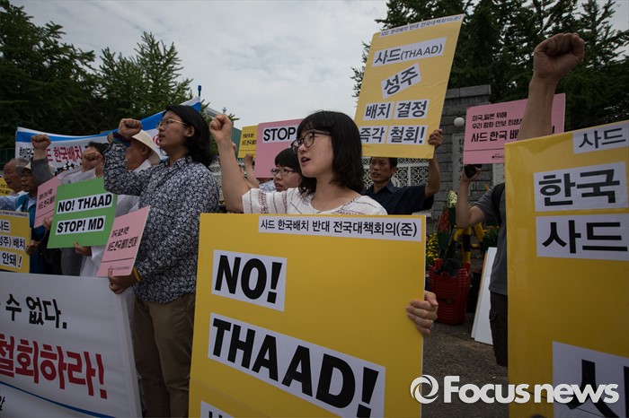 (서울=포커스뉴스) 국방부에서 주한미군 고고도 미사일 방어 체계 사드(THAAD) 배치 지역을 성주로 결정하고 공식 발표를 앞둔 13일 오후, 평통사 관계자 및 시민들이 서울 용산구 국방부 앞에서 정부를 규탄하는 시위를 하고 있다.