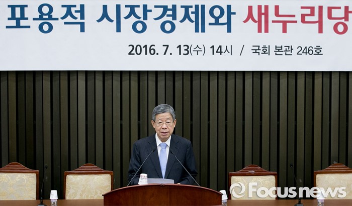 (서울=포커스뉴스) 13일 오후 서울 여의도 국회에서 열린 포용적 시장경제와 새누리당의 진로 토크 콘서트에 참석한 김희옥 혁신비대위원장이 축사를 하고 있다.