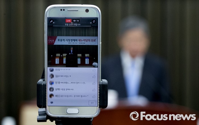 (서울=포커스뉴스) 13일 오후 서울 여의도 국회에서 열린 포용적 시장경제와 새누리당의 진로 토크 콘서트에 참석한 김희옥 혁신비대위원장의 축사를 하고 있는 모습이 SNS를 통해 생중계되고 있다.