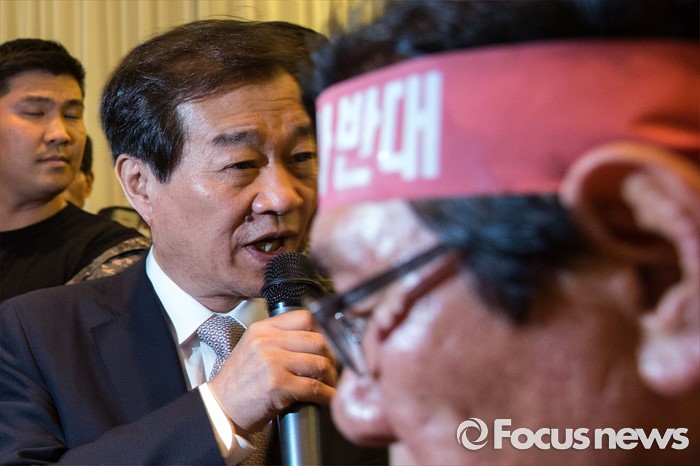 (서울=포커스뉴스) 국방부가 사드 배치 지역을 경북 성주로 확정지은 13일 오후 서울 용산구 국방컨벤션에서 황인무(왼쪽) 국방부 차관이 상경한 성주군민들과 대화하고 있다.