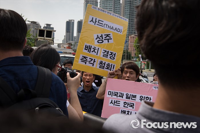 (서울=포커스뉴스) 13일 오후 평통사(평화와 통일을 여는 사람들) 관계자 및 시민들이 서울 용산구 국방부 앞에서 성주 사드 배치 반대 시위를 하고 있다. 이날 국방부는 주한미군 고고도 미사일 방어 체계 사드(THAAD) 배치 지역을 성주로 결정, 발표 했다.