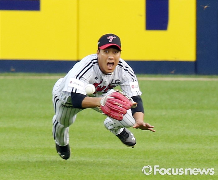 (서울=포커스뉴스) 13일 서울 잠실구장에서 열린 2016 프로야구 한화-LG 경기 1회초 2사 2,3루에서 LG 중견수 이천웅이 한화 김경언의 중전 안타를 잡으려 다이빙하고 있다.