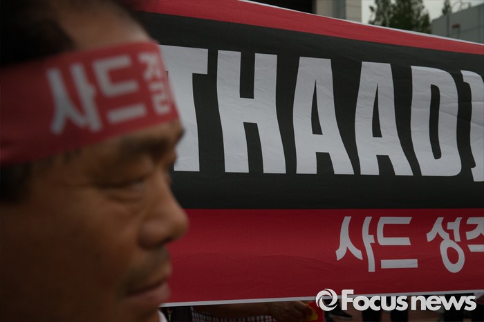 (서울=포커스뉴스) 13일 오후 서울 용산구 국방컨벤션을 찾은 군민들이 사드배치 반대 집회를 하고 있다.이날 국방부에서 주한미군 고고도 미사일 방어 체계 사드(THAAD) 배치 지역을 성주로 결정하고 공식 발표했다.