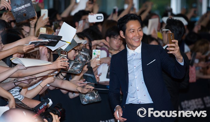(서울=포커스뉴스) 13일 오후 서울 영등포구 타임스퀘어에서 열린 영화 '인천상륙작전' 레드카펫 행사에 참석한 배우 이정재가 팬들과 사진 찍고 있다.