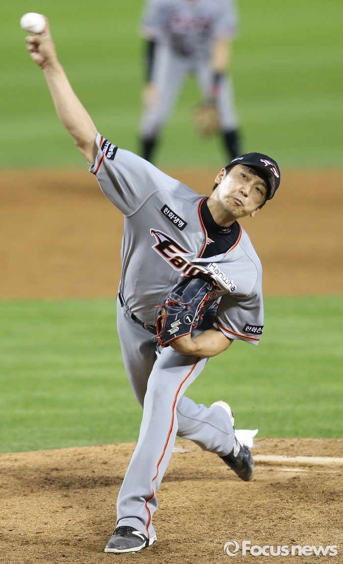 (서울=포커스뉴스) 13일 서울 잠실구장에서 열린 2016 프로야구 한화-LG 경기 4회말 1사 만루에서 한화 투수 심수창이 선발 송은범을 구원 등판해 투구하고 있다.