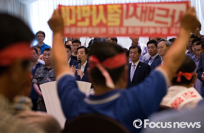 (서울=포커스뉴스) 한민구 국방부 장관이 13일 오후 서울 용산구 국방컨벤션센터에서 사드 배치에 항의 방문 중인 김항곤 성주군수 등 사회단체장 및 군민들과 대화하고 있다. 국방부는 이날 경북 성주군을 고고도 미사일 방어(사드·THAAD)체계 배치 지역이라고 공식 발표했다.