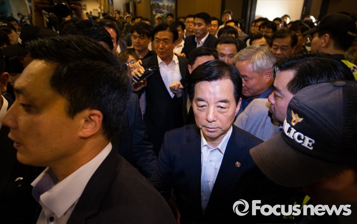 (서울=포커스뉴스) 한민구 국방부 장관이 13일 오후 서울 용산구 국방컨벤션센터에서 사드 배치에 항의 방문 중인 김항곤 성주군수 등 사회단체장 및 군민들에게 사과 발언을 하고 자리를 떠나고 있다. 국방부는 이날 경북 성주군을 고고도 미사일 방어(사드·THAAD)체계 배치 지역이라고 공식 발표했다.