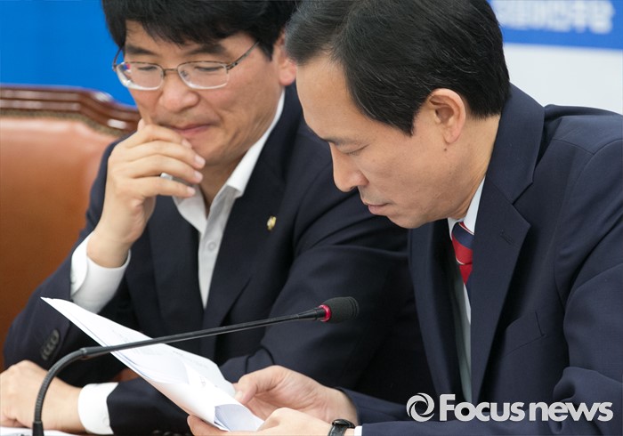 (서울=포커스뉴스) 14일 오전 서울 여의도 국회에서 열린 더불어민주당 정책조정회의에 참석한 우상호(오른쪽) 원내대표와 박완주 원내수석부대표가 대화하고 있다.