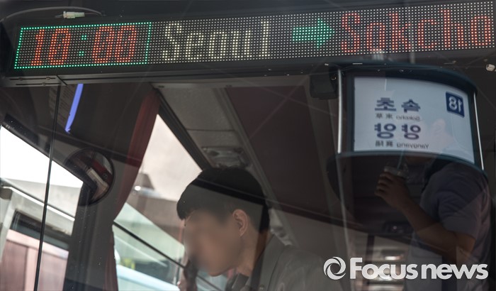 (서울=포커스뉴스) 14일 오전 서울 서초구 고속버스터미널에서 강원도 속초행 버스 승무원이 승객을 맞이할 준비를 하고 있다.