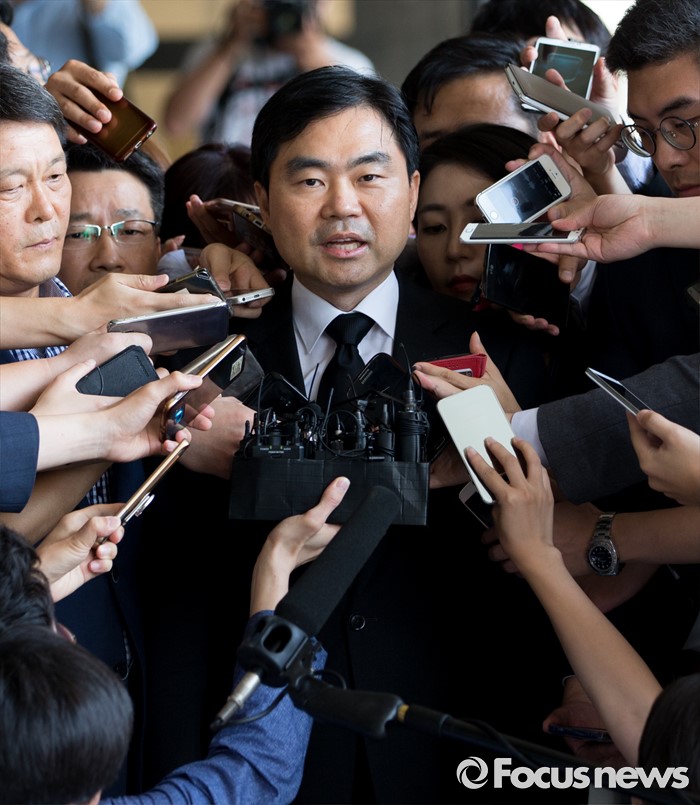 (서울=포커스뉴스) '주식 대박' 논란에 휩싸인 진경준 검사장이 14일 오전 서울 서초구 서울중앙지방검찰청으로 출석하고 있다.