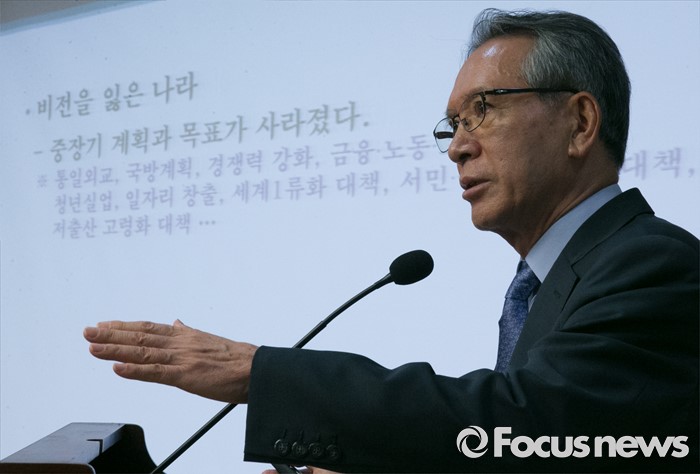 (서울=포커스뉴스) 14일 오전 서울 여의도 국회 의원회관에서 한국적 제3의 길(대표의원 박영선) 후원으로 열린 '개헌을 말하다'에 참석한 김형오 전 국회의장이 개헌의 필요와 방향에 대한 강연을 하고 있다.