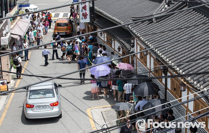 (서울=포커스뉴스) 초복을 사흘 앞둔 14일 오후 서울 종로구에 위치한 한 삼계탕 전문식당을 찾은 시민들이 줄을 서고 있다.