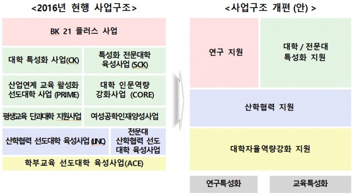 특히 기존 특성화 사업(CK, PRIME, CORE, 평생교육단과대학지원 등)을 통합하여 각 대학에서 강점을 가지는 분야의 특성화를 지원해 대학의 교육연구 역량강화를 유도할 계획이다.