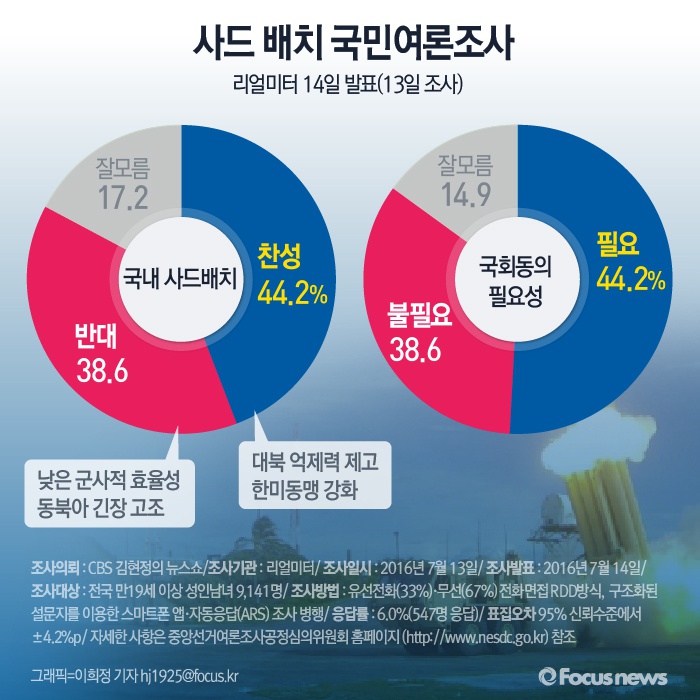 (서울=포커스뉴스) 14일 발표한 여론조사기관 리얼미터 국민여론 조사에 따르면 '대북 억제력 제고와 한미동맹 강화를 위해 찬성한다'는 의견이 반대 의견보다 약간 우세한 것으로 나타났다. 사드 배치 결정 시, 국회동의가 필요한지에 대한 조사는 필요하다는 의견이 우세했다.