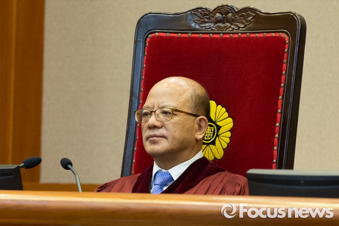 (서울=포커스뉴스) 14일 오후 서울 종로구 헌법재판소 대심판정에서 박한철 헌법재판소장이 비례대표 국회의원 후보 공개연설 금지 공개 변론를 위해 자리에 착석해 있다.