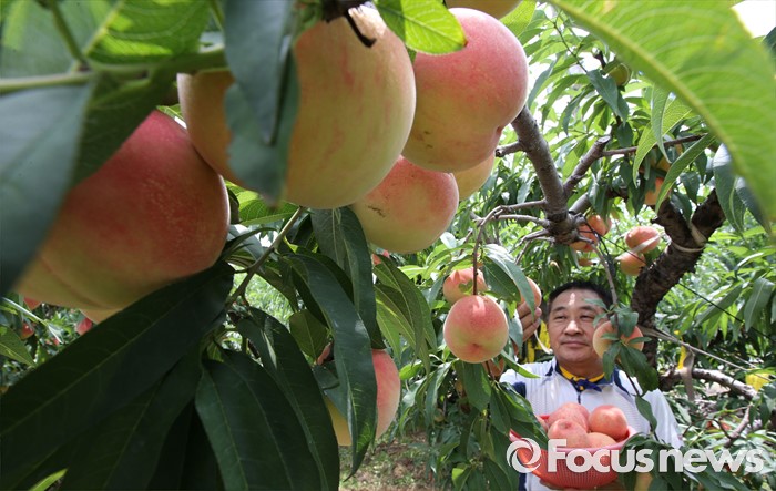 (세종=포커스뉴스) 초복을 사흘 앞둔 14일 세종시 조치원읍 복숭아농장에서 농민이 복숭아를 따고 있다.