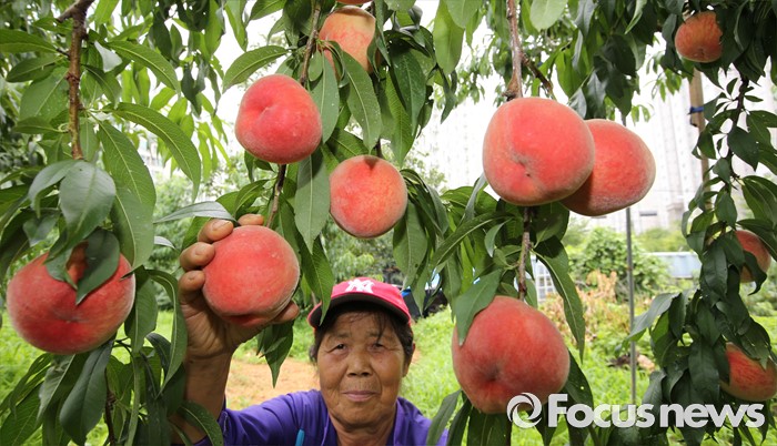 (세종=포커스뉴스) 초복을 사흘 앞둔 14일 세종시 조치원읍 복숭아농장에서 농민이 복숭아를 따고 있다.