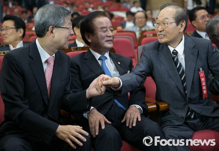 (서울=포커스뉴스) 14일 오후 서울 여의도 국회 의원회관에서 열린 새누리당 전국위원회에 참석한 김희옥(왼쪽부터) 혁신비대위원장, 정갑윤 전국위의장, 정재철 상임고문이 대화하고 있다.