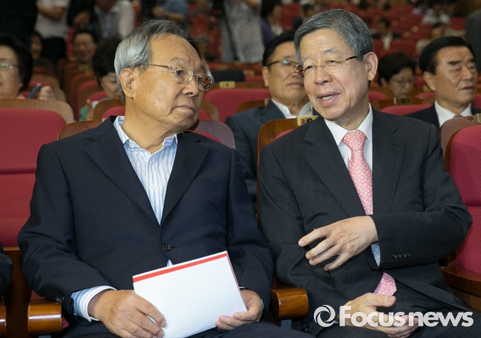 (서울=포커스뉴스) 14일 오후 서울 여의도 국회 의원회관에서 열린 새누리당 전국위원회에 참석한 김희옥(오른쪽) 혁신비대위원장과 박관용 전 국회의장이 대화하고 있다.