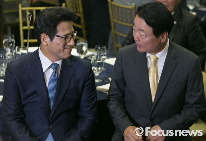 (서울=포커스뉴스) 14일 오후 서울 영등포구 그랜드컨벤션센터에서 열린 김무성 새누리당 전 대표 취임 2주년 행사에 참석한 정병국(왼쪽), 한선교 의원이 대화하고 있다.