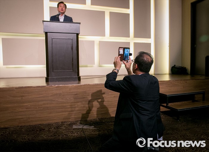 (서울=포커스뉴스) 14일 오후 서울 영등포구 그랜드컨벤션센터에서 열린 당대표 취임 2주년 행사에 참석한 한 지지자가 김무성 새누리당 전 대표의 인사말하는 모습을 촬영하고 있다.