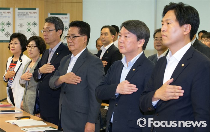 안 전 대표는 이날 긴급토론회 직후 기자들과 만나 "국가적인 중요한 현안에 대해서는 대통령이 주도적으로 설득 노력을 해 문제를 풀어주는 것이 바람직하다"며 "필요하다면 여야 3당 대표를 청와대로 부르는 등 다양한 방법이 있다. 박 대통령이 직접 소통하고 설득하려는 노력을 더 하시면 좋겠다"고 덧붙였다.14일 오후 서울 여의도 국회 의원회관에서 국민의당 주최로 열린 '국민의 동의없는 사드 배치 올바른 결정인가' 토론회에 참석한 손금주(오른쪽부터) 대변인, 안철수 전 대표, 박지원 비대위원장, 김성식 정책위의장 등 참석자들이 국기에 대한 경례를 하고 있다. 2016.07.14 박동욱 기자