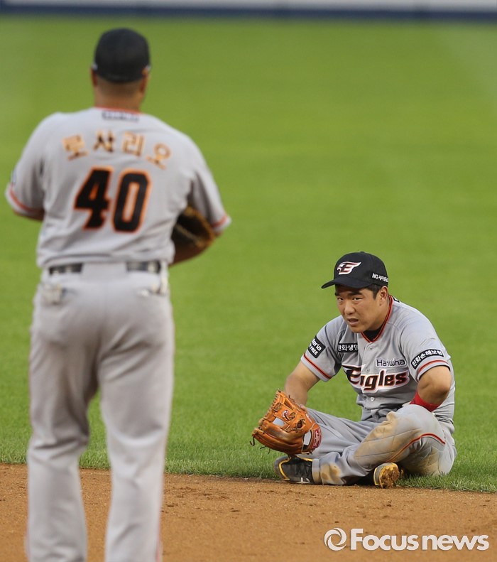 정근우는 지난 2005년 드래프트에서 2차 1라운드 7순위로 SK 유니폼을 입었다. 데뷔 첫해에는 17안타에 그쳤지만 2006시즌 122안타를 기록했다. 한화 유니폼을 입고 뛴 첫해인 2014시즌에는 137안타, 지난시즌은 148안타를 때려냈다.(서울=포커스뉴스) 13일 서울 잠실구장에서 열린 2016 프로야구 한화-LG 경기 4회말 한화 2루수 정근우가 LG 이천웅의 우전 안타때 타구를 잡으려다 왼쪽 옆구리에 충격을 받고 주저앉아 몸을 추수리고 있다.2016.07.13 우정식 기자