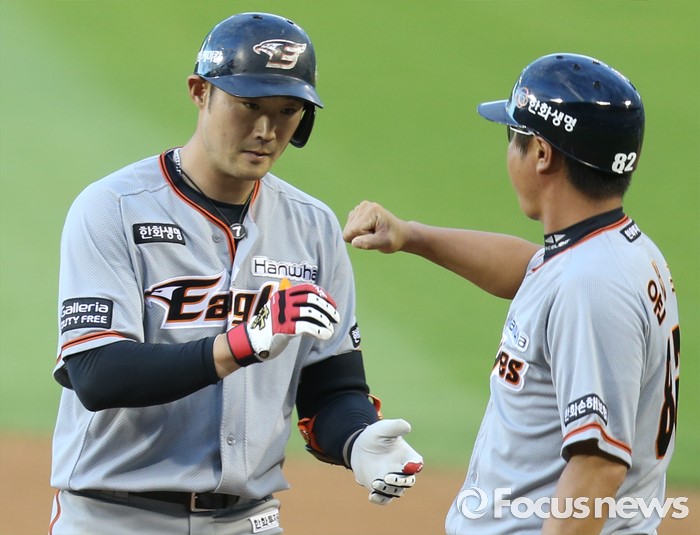 (서울=포커스뉴스) 14일 서울 잠실구장에서 열린 2016 프로야구 한화-LG 경기 2회초 2사 1,3루에서 한화 송광민이 좌전 적시타를 치고 1루에서 윤재국 코치의 환영을 받고 있다.