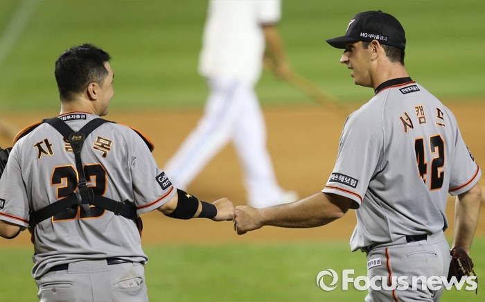 (서울=포커스뉴스) 14일 서울 잠실구장에서 열린 2016 프로야구 한화-LG 경기에서 한화 포수 차일목이 4회말 수비를 마치고 새 외국인 투수 서캠프와 주먹을 마주치며 호투를 격려하고 있다.