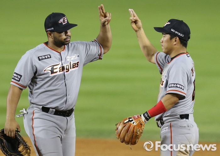 (서울=포커스뉴스) 14일 서울 잠실구장에서 열린 2016 프로야구 한화-LG 경기에서 LG에 승리하며 순위 바꿈을 해 7위로 올라선 한화 김정근우와 로사리오가 손가락 마주치기를 하고 있다.