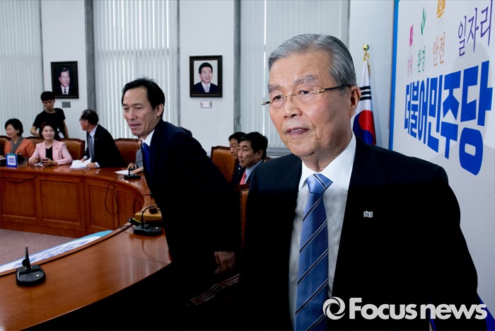(서울=포커스뉴스) 15일 오전 서울 여의도 국회에서 더불어민주당 비상대책위원회의를 마친 김종인(오른쪽) 비대위 대표와 우상호 원내대표가 퇴장하고 있다.