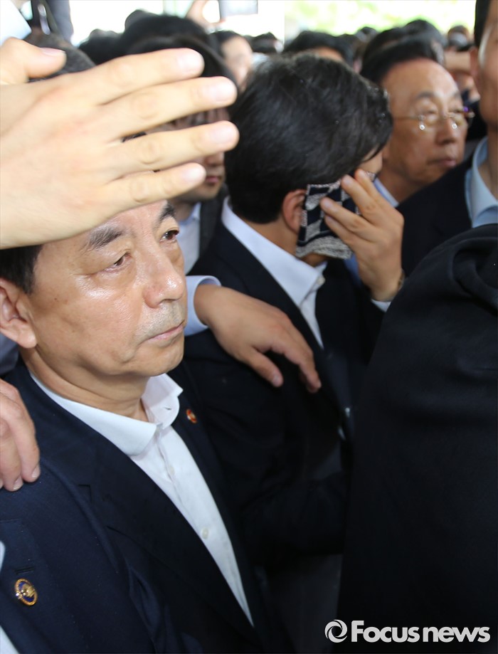(성주=포커스뉴스) 황교안 국무총리가 15일 오전 경북 성주군청광장에서 사드(THAAD, 고고도미사일방어체계) 배치에 대한 주민설명회에서 주민이 던진 물병에 맞고 손수건으로 얼굴을 닦고 있다.