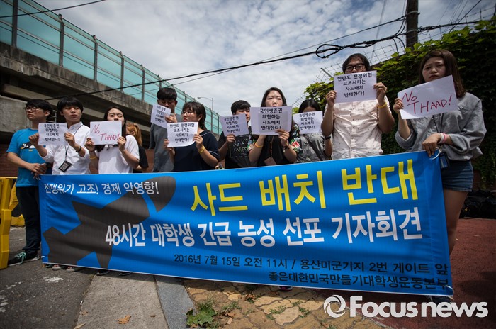 (서울=포커스뉴스) 좋은 대한민국 만들기 대학생 운동본부' 소속 학생들이 15일 오전 서울 용산 미군 기지 앞에서 '사드 배치 반대 48시간 대학생 긴급농성 선포' 기자회견을 열고 있다. 이날 대학생들은 기자회견을 마친 후 용산 미군 기지 2번 게이트 앞에서 48시간 농성에 들어갔다.